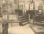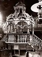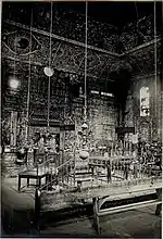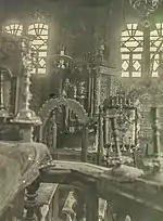The octagonal bima in the middle of the hall, richly decorated with wood carvings, was in the shape of a small arbor-like chapel. The Torah shrine was a cupboard adorned with floral motifs and standing on a desk. |
