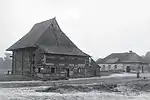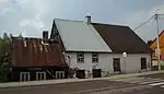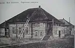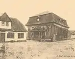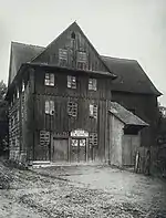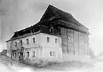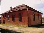The building is not oriented strictly from west to east, but from southwest to northeast. It is 11.85 m long and 7.88 m wide, the outer walls are 6.95 m high. In addition to the traditional synagogue architecture, expressionist elements such as an asymmetrically arranged tower on the southwest corner to highlight the main entrance, high, pointed windows and dormers on the hipped roof were used. There were two stars of David on the tower. The single-story main room was to the southeast; in the northwest there was a two-story construction with three rooms on the ground floor (anteroom to the men's bed room, the staircase to the women's bed room above and a heated room in between). There were separate entrances and smaller square windows. The building had eight large windows: three each on the long sides and two in the southeast, between which the Torah shrine stood. The bima was in the center of the room (slightly offset to the rear). Rows of seats were arranged next to the bima and between the bima and the Torah shrine. When it was converted into a warehouse, the windows were closed with boards, the interior was destroyed and a large gate was added in the southeast.[31] After the Second World War it was used as a warehouse for a long time (after renovations) and has been empty since the 1990s. The synagogue has been restored since 2019. |