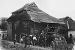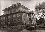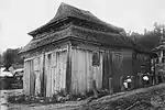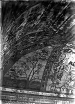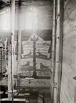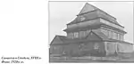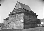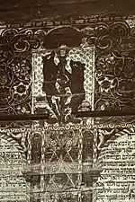 The walls were richly decorated with biblical verses and prayers. The vault was especially richly decorated. Following the example of Polish landowners' seats, at the façade there were corner alcoves, often used in synagogues in the mid-18th century. Between the two wars, Professor Oskar Sosnowski of the Department of Architecture of the Polytechnic of Warsaw, and photographer and art historian Szymon Zajczyk directed architects to create extensive documentation of the wooden synagogues. They created architectural drawings, replica paintings, and photographs. Much of this project was destroyed during World War II but a substantial amount survived.[14] The synagogue in Hrodna was measured and photographed in 1928. |