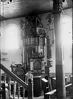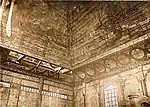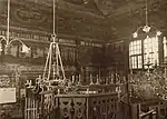 The roof consisted of two lower hipped roof steps and a gable roof on the third level. Inside, the ceiling was expanded into an octagonal dome. The walls and the ceiling were painted multicolored with animal-shaped mythical creatures and psalms. The bima was also an octagonal podium with a balustrade. The Torah shrine was richly decorated with carvings.[19] |