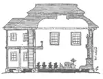 Presumably each side had two pairs of high-mounted twin windows. The high hipped roof had a baroque-style gable on the west with a small window in the middle. |