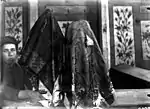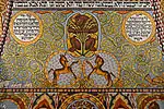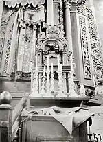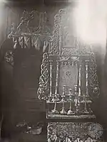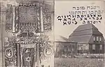 A narrow extension to the west was the same height as the whole building and led to the vestibule. The men's prayer room had two rectangular windows on three sides to the north, east and south; the two floors of the vestibule and women's room had two smaller windows on each side. The roof was two-tiered with a mansard roof and above it a hipped roof that merged into a gable roof. The narrow extension to the west had a gable roof. During the alterations and renovations after the First World War, the rectangular windows were replaced by arched windows and the extension in the west was demolished and a portico with a gable roof was built in its place. The walls were (mainly) decorated with floral ornaments. The bima was a simple table covered with a tablecloth. There were fixed rows of seats for the assembled. The Torah shrine consisted of four levels that tapered towards the top and were framed by columns. The Torah scrolls themselves were on the second level behind a carved folding door. Above were the tablets of the law. Among them was a saying from the Talmud. This was very unusual as the Karaites only refer to the Torah and reject the Talmud. The Torah shrine was probably made by a member of Rabbinic Judaism, as their own community was too small to find a skilled craftsman.[35] |