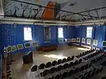 The main hall was almost square with 12.00 × 12.75 m. The height of the walls was 7.30 m; it was 10.50 m to the top of the vault and the roof had receded gradually until the renovation. The octagonal bimah stood near the entrance; During the restorations between 1909 and 1910, the presumably wooden construction was replaced by a cast one. The Torah shrine was probably built later than the main hall. It consisted of two different parts that weren't the same age: the shrine itself and a flat frame with sculptures attached to the wall. Shortly after its construction, the building was richly decorated with multicolored paintings by Israel, son of Mordechai Liśnicki from Jaryczów.[7] Further restorations of the interior decoration took place in 1895 and 1905.[8] |