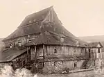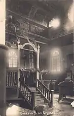 In front of the room was a vestibule and next to it another room for the kehillah. Above was the women's prayer room, which only allowed a view into the main room through narrow slits. Access to the women's room was via a staircase along the south wall. This led to a covered balcony that was supported by columns. The roof was an extension of the main roof. The roof itself was two-tiered, the lower part was a hipped roof and above it a gable roof. The three outer sides of the men's prayer room each had two pairs of windows. The bima was not in the middle of the room, but was offset towards the entrance. It had a canopy and was richly decorated. The Torah shrine stood on a console and was two-tiered with side wings. The essay protruded into the vault. The exact shape of the vault is doubtful, it has been described as both an octagonal dome and a barrel vault.[5] The bima and the Torah shrine, like the building, were most likely from the end of the 18th century, as were the colored wall paintings. These had faded at the beginning of the 20th century. Only in the vault were there figures, probably the signs of the zodiac. In these, the faces of the human figures were painted over. In the 19th century, another room for women was added along the north wall at ground level, along the length of the main room. The vestibule was also given a small porch through which the building could be entered. The women's room had a pent roof, this partially covered the windows to the main room, just like the gable roof of the porch covered the windows of the women's room above the vestibule. |