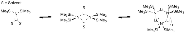 Like many organolithium reagents, lithium bis(trimethylsilyl)amide can form aggregates in solution. The extent of aggregation depends on the solvent. In coordinating solvents, such as ethers[8] and amines,[9] the monomer and dimer are prevalent. In the monomeric and dimeric state, one or two solvent molecules bind to lithium centers. With ammonia as donor base lithium bis(trimethylsilyl)amide forms a trisolvated monomer that is stabilized by intermolecular hydrogen bonds.[10][11] In noncoordinating solvents, such as aromatics or pentane, the complex oligomers predominate, including the trimer.[9] In the solid state structure is trimeric.[12]