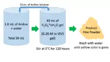 V2O5 gels are prepared using the ion-exchange method.[2] Vanadium (V) polymerizes aniline. Before synthesis of a hybrid battery, potentiometric titration of V2O5 gel with is carried out; this determines the amount of V(V) present in the gel. Aniline solution is slowly added onto the gel. The following procedure is demonstrated in Figure 3.