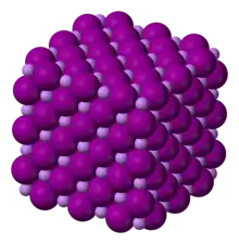 Lithium iodide, or LiI, is a compound of lithium and iodine. When exposed to air, it becomes yellow in color, due to the oxidation of iodide to iodine.[2] It crystallizes in the NaCl motif.[3] It can participate in various hydrates.[4]