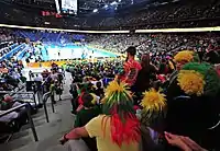 For the fourth post-independence Olympics, basketball captain Saulius Štombergas was given the honor to bear the Lithuanian flag during the opening ceremony.[103] The Olympic basketball for Lithuania started slowly, laboring to a victory against the African champions Angola 78–63, with their opponents shooting an excellent 52% from the three-point line. Lithuanian national team also had difficulties with Puerto Rico, depending on a high average of three-pointers to beat the NBA-heavy squad by 98–90. Then Lithuanians, in front of 12,000 spectators, achieved revenge against their Greek hosts, defeating them 98–76. The next match would be against the United States, which again featured major NBA stars such as Allen Iverson, Tim Duncan, and LeBron James, but had already been proven as faltering following a defeat to Puerto Rico. Lithuania managed to beat the United States 94–90, only the fourth defeat by the Americans in the Olympic stage.[104] Jasikevičius, who had lost a possible buzzer beater against the Dream Team four years before, managed to score 28 points, including a decisive 10-point barrage in 69 seconds that gave Lithuania the lead in the final minutes.[105] While the fifth game, versus Australia, was not significant for the group standings as the Lithuanians had already secured the first spot in the group, the Lithuanians still won 100–85, maintaining their good run.[106]