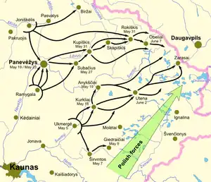 On May 18, the reorganized army carried out its first operation. The Vilkmergė Group captured Kurkliai and Anykščiai.[64] On May 22, the Group launched an attack on Utena. The initiative was met by a Soviet counterattack and the Lithuanian forces retreated. Further attacks were stopped for several days to wait for the results of the advance on Kupiškis.[65] The drive towards Utena resumed on May 31, and the city was secured on June 2. The Panevėžys Group launched a drive towards Panevėžys on May 18 and secured the city the following day, but lost it to a Bolshevik counterattack, carried out on May 21.[32] However, the Soviets left Panevėžys without a fight two days later.[66] The Group charged towards Kupiškis and secured Subačius. On May 30, Joniškėlis' partisans broke through the Soviet lines and liberated Rokiškis in Soviet rear;[67] Bolshevik forces, afraid that they could be encircled, left Kupiškis on the night of May 30–31, and Lithuania secured that city on June 1.[68]