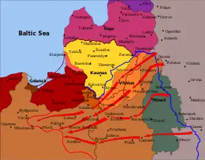 Red Army captured one town after another: Zarasai and Švenčionys (Dec. 22), Utena (Dec. 23), Rokiškis (Dec. 27), Vilnius (Jan. 5), Ukmergė and Panevėžys (Jan. 9), Šiauliai (Jan. 15), Telšiai (Jan. 25).[30] That accounted for about 2⁄3 of the Lithuanian territory. The front somewhat stabilized when Soviet forces were stopped near the Venta River by Latvian and German units (Baltische Landeswehr).[33] Also, Germans slowed down the withdrawal of their troops after the Spartacist uprising was subdued on January 12.[34] Southern Lithuania was a little better protected as Germans retreated from Ukraine through Gardinas. To prevent fights between retreating Germans and the Red Army, the Soviets and Germans signed a treaty on January 18. The treaty drew a temporary demarcation line that went through Daugai, Stakliškės, and 10 kilometres (6.2 mi) east of the Kaišiadorys–Jonava–Kėdainiai railway.[35] That barred Bolshevik forces from directly attacking Kaunas, Lithuania's second-largest city. The Red Army would need to encircle Kaunas and attack through Alytus or Kėdainiai. The operation to take Kaunas began on February 7.