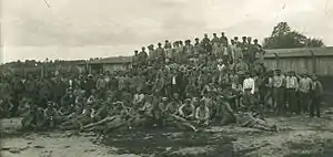 ![]() Soviet prisoners of war in a Lithuanian camp. As of December 1, 1919, the Lithuanians held 1,773 Soviet prisoners.[1] | |||||||