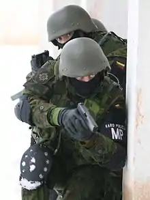 The Lithuanian Military Police (Lithuanian: Lietuvos karo policija) is a law enforcement agency operating within the national defence system of the Republic of Lithuania and is a part of the Lithuanian Armed Forces. Military Police are directly subordinate to the Chief of Defence of the Republic of Lithuania. Main tasks of Military Police include preventing of crimes and other breaches of legal acts, investigating and disclosing offences, enforcing law and order in military territories and in the armed forces and ensuring the security of military traffic.