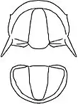 Like all Agnostida, Litometopus is diminutive and the headshield (or cephalon) and tailshield (or pygidium) are of approximately the same size (or isopygous) and outline. Like all Weymouthiidae, it lacks eyes and rupture lines (or sutures). The cephalon is almost semicircular. The central raised area of the cephalon (or glabella) has a furrow along its outline, but no furrows are crossing it. It tapers forward and touches the border furrow. The border is convex, and it carries pair of small marginal spines at approximately ⅓ of the cephalic length from the front, and large genal spines, that are directed backwards and slightly outwards (±15°). Pygidium is the same shape as the cephalon. The pygidial axis is tapering backwards and touches the border furrow. It has a furrow along its outline, but crossing furrows are very faint or indiscernible. The border is flat and wide, and its doublure is sloping adaxially, and with serrated margin.[3]