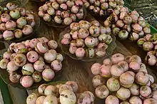 The fruit is eaten raw or cooked, and the tree is sometimes cultivated for its fruit. When eaten raw, it is rolled in the hands or hit with a spoon to cause slight bruising in order to release the flavor.[8] A popular way of eating the fruit is to submerge it in hot water for five minutes, then sprinkle it with salt. It is sometimes served steamed with rice. Unripe fruits are pickled.[9] An oil is extracted from the seed, which is used to make candles and soap. The wood is used in construction.[6] Litsea garciae has many medicinal uses. The Iban use the lightly burned bark to treat caterpillar stings, and use a bark poultice to treat boils. The Selako use a poultice of the leaves or shoots along with shallot and fennel seeds to cure infections and skin diseases. It is also used to treat skin burns. The Penan use a bark poultice for sprained knees, ankles, and muscular pains. Decoctions made from the bark are also used to help ailments such as blood in stools, and are mixed with durian bark to make an antidote for snakebite wounds.[3]