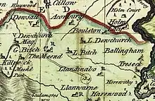At the north-east centre of the parish is Athelstans (or Athelstan's) Wood, rectilinear of 1,200 yards (1,000 m) by 800 yards (700 m) and extending to all but 100 yards (90 m) across the parish. The wood is conjoined at north to Rough Hill Wood in Aconbury parish.[9][10][11][12] Athelstans Wood, named after Athelstan, Bishop of Hereford (died 1056), became a royal wood along with Aconbury Wood and Harewood. Aconbury Priory was established by King John, who gave priory nuns felling and selling rights to Athelstans Wood. Following the Dissolution of the Monasteries in the 16th century, the woods became the property of the Scudamore family, who until at least the 18th century coppiced the wood to make charcoal for fueling forges, while oak bark was used in the leather tanning process. The extent and characteristics of the wood remained the same from this time until after the Second World War, witnessed by aerial photographic evidence of 1946. Before felling from the 1950s, making room for the wide commercial coniferisation of the 1970s approved by the Forestry Commission, the woods were of lime and ash, with "oak and sweet chestnut trees and the sheets of bluebells and wood anemones under the coppice".[24]