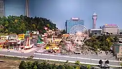 The Toronto destination, which took over 35,000 hours to design and build, includes GO Transit trains and Union Station, the Art Gallery of Ontario, Toronto City Hall,[4] helicopters, streetcars,[3] the Don Valley Parkway,[4] and the Gardiner Expressway.[5] During the morning portion, sound effects include chirping birds, barking dogs, and garbage trucks making rounds.[3] During the sunset portion of the exhibit, the skyline is lit by 30,000 LEDs,[3] with sounds of crickets and sirens.[8] The replica of the Rogers Centre, which cost $60,000 to build and occupies a space of 5 by 5 feet (1.5 by 1.5 m),[5] has a functional retractable roof and contains a scoreboard that will show highlights from the preceding day's Toronto Blue Jays game.[3] The field depicts the instance Joe Carter hit a walk-off home run to clinch the Blue Jays' victory in the 1993 World Series against the Philadelphia Phillies.[8]