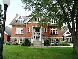 The library is built in the American Craftsman style, constructed of brick and stone and measuring two stories. The basement is constructed with locally-sourced fieldstone arranged in a random pattern, which can be seen surrounding the exterior of the building. Buff-colored bricks are used for the main level, which is separated from the basement level with a gray granite water table. The building is covered by a dormered gable roof. The exterior has a lack of ornamentation, although some can be found on the bargeboard on the gables and dormers and the granite quoins that surround the front entrance. The building was built on a cruciform plan, which is evident in the interior arrangement within the library. The main floor features a centrally-located circulation area with reading rooms to the left and right and bookshelves to the rear. Originally, the lower floor served as an auditorium but has since been converted to a children's area. The attic is a large, finished area used for storage.[4]
