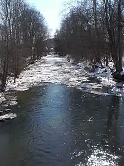 One type of soil series found in the vicinity of Little Fishing Creek is the Middlebury Series. This soil series ranges from deep and fairly well-drained to poorly-drained alluvial soil. It consists of Tioga soils and Holly soils.[17] All of the rock in the creek's watershed upstream of the United States Geological Survey's stream gauge is shale or sandstone.[8] A fairly narrow band of rock of the Hamilton Group is located near the creek. Rock outcroppings of the Chemung Formation are visible in Hemlock Township, approximately 1 mile (1.6 km) upstream of Fishing Creek.[18] Rock formations consisting of shale and sandstone are present in the vicinity of the creek.[13] Numerous riffles occur on parts of Little Fishing Creek. There are also strainers in places.[19]