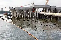 Each pot has four to six lightweight concrete sections, referred to as "petals", which are designed to reduce the load on the pilings.[10][11] The precast concrete is also meant to be resistant to erosion and corrosion.[11] The concrete pots were manufactured by the Fort Miller Company at their factory in Easton in Upstate New York.[10][12] The Fort Miller Company hired a partner to create foam molds for the pieces of the pots using a laser cutter, then cleared out a 600-foot-long building for these foam pieces. Thirty-nine types of molds were fabricated. According to the company's president, "A full one-third of our annual production capacity was displaced by this project."[11]