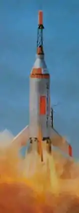 Little Joe 1A (LJ-1A) was an uncrewed rocket launched as part of NASA's Mercury program on November 4, 1959.[1] This flight, a repeat of the Little Joe 1 (LJ-1) launch, was to test a launch abort under high aerodynamic load conditions. After lift-off, the pressure sensing system was to indicate when the correct abort dynamic pressure was reached.[2] This should have happened about thirty seconds after launch.[2] A signal was sent to the explosive bolts to separate the spacecraft from the launch vehicle.[2] Up to this point, everything was going as planned.[2] The impulse was also intended to ignite the escape motor.[2] The motor was ignited, but it took a number of seconds to build up thrust, and thus the abort maneuver was not accomplished at the desired dynamic pressure.[3] Because of this, a repeat of the test was planned. Other events from launch through recovery occurred without incident.[3] An altitude of 9 statute miles (14.5 km) and a range of 11.5 statute miles (18.5 km) were obtained, and a speed of 2,021.6 miles per hour (3,254 km/h) was reached. Flight time 8 minutes 11 seconds.[4] Payload 1,007 kg.