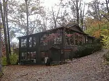 The Esta Cabin encapsulates the history of the Loomhouse, and is the cabin where the song "Happy Birthday to You" was first sung.[2][3] The cabin was first built by a Beoni Figg in 1870 as a business office for his charcoal, lumber, and quarries interests. It has been enlarged since then from a two-room cabin. One of these enhancements replaced the vertical split log siding with board and batten.[4] In 1939 Lou Tate acquired the cabin and based her weaving business there, living on the property until her death in 1979. On a visit in the 1940s while still the First Lady, Eleanor Roosevelt crushed a floorboard, which she later signed; it is now lost. While visiting the Loomhouse, Mrs. Roosevelt bought woven mats that would see use in the White House.[5] Displays of weaving decorate the interior.[6]