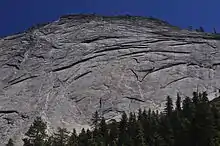 Cascade Cliffs is a wall of unjointed granite that rises to 8,170 ft (2,490 m) AMSL, 1,930 ft (588 m) above the Merced River and make up the southern wall of Little Yosemite Valley at 37°43′27.73″N 119°29′13.56″W, 1.6 mi (3 km) southwest of Bunnell Point and 2.4 mi (4 km) northeast of Mount Starr King, of which Cascade Cliffs comprises the northern flank. In few other places in the Yosemite region is the granite more continuously massive than in the Cascade Cliffs. Only one horizontal master joint divides the rock (in the lower left) The scales on the cliffs are merely surficial features due to exfoliation. The dark streaks indicate the paths followed by the ribbon cascades which descend from the upland in the spring, when the snow is melting, and from which the cliffs take their name. There are two wide, relatively short yet quite deep arches at the bottom of the cliff.[3]