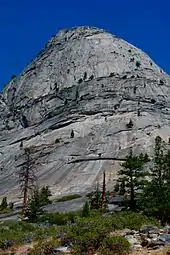 Moraine Dome is a granite dome in Yosemite National Park along the northern margin of Little Yosemite Valley at 37°44′35.15″N 119°29′24.49″W which rises to an elevation of 8,036 ft (2,449 m) AMSL, 1,906 ft (581 m) above the Merced River. Moraine Dome is notable because the presence of lateral moraines from the Merced Glacier. It is likely that these moraines represent the highest level attained by glacial ice in Little Yosemite Valley.[5] Although it is about as high as Sentinel Dome Moraine Dome is dwarfed to relative insignificance by its proximity to the bulk and elevation of Clouds Rest to the north.[5]