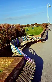 Littlehampton is home to Britain's longest bench.[35][36] The bench was designed by Studio Weave, a London-based architecture practice and opened in mid-July 2010.[35] It was designed based on initial ideas by children from Littlehampton's Connaught Junior school and was funded by Anita Roddick's husband Gordon and from a CABE grant from the Department for Culture, Media and Sport.[35][37]