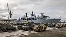 An LRG typically consists of an Albion-class landing platform dock and a Bay-class landing ship dock, along with a company of 250 Royal Marines.[8] In 2021, the Ministry of Defence announced it would be investing £50 million into upgrading one of the Bay-class landing ship docks to better facilitate its role within the LRG concept, with upgrades to its command and control facilities and the installation of a permament hangar.[8] This was to have been a stopgap solution until the entry into service of the new Multi-Role Support Ships (MRSS) in the 2030s.[10][8] However, in July 2022, it was reported that the future Littoral Strike role would be assumed by RFA Argus after a refit to convert her.[11] Escort will be provided by at least one frigate or destroyer.[12]