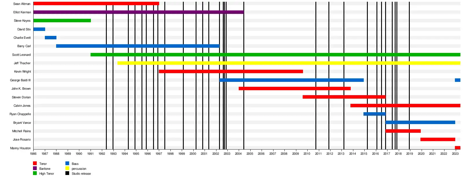 | Past members | Sean Altman Elliott Kerman Steve Keyes David Stix (deceased) Charlie Evett Barry Carl Kevin Wright John K. Brown George Baldi III Steven Dorian Ryan Chappelle Mitchell Rains Jose Rosario Bryant Vance |
