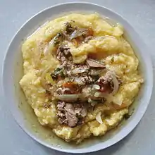 Mămăligă (cornmeal mush) with chicken liver, cuisine of Moldova