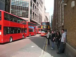 Liverpool Street bus station is located within Liverpool Street station and is next to the Broadgate shopping and office complex. It has been closed since 2017 until September 2019 to allow construction work on the adjacent Broadgate site redevelopment.[1]
