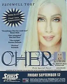 Living Proof: The Farewell Tour (also referred to as simply The Farewell Tour and later dubbed The Never Can Say Goodbye Tour) was the fifth concert tour by American singer-actress Cher to promote her twenty-fourth studio album, Living Proof and her eighth official compilation album, The Very Best of Cher.[2] It began on June 14, 2002 in Toronto, Ontario, Canada and was originally planned as a 59-date tour in North America.