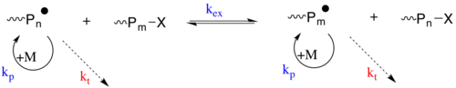 The second strategy is based on a degenerative transfer (DT) of the propagating radical between transfer agent that acts as a dormant species (i.e. Reversible addition−fragmentation chain-transfer polymerization). The DT based CRP's follow the conventional kinetics of radical polymerization, that is slow initiation and fast termination, but the transfer agent (Pm-X or Pn-X) is present in a much higher concentration compared to the radical initiator. The propagating radical species undergoes a thermally neutral exchange with the dormant transfer agent through atom transfer, group transfer or addition fragment chemistry.[19]