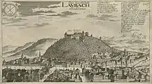 Until 1144 the castle became property of the House of Sponheim.[4] In 1256, Ljubljana Castle was mentioned in a document as the most important castle of the rulers of Carniola (Latin: castrum capitalis).[5] In the late 1270, it was conquered by King Ottokar II of Bohemia. In 1278, after the defeat of Ottokar, it became property of Rudolph of Habsburg.