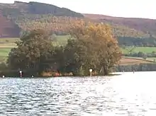 The crannog is a small artificial island about 40 metres (130 ft) from the north shore. It is constructed of massive planks of oak behind which was built a dwelling platform formed from layers of stone, soil and brushwood.[9] It was investigated by archaeologists from the National Museum of Wales between 1989 and 1993. Finds included a high quality textile and a bronze hinge from an 8th–9th century reliquary decorated in a style similar to that seen in Ireland.[10] The 1993 dig was joined by the TV series Time Team and featured in series one, episode four in 1994.[11] In 2005, works were carried out to protect the island from erosion.[10]