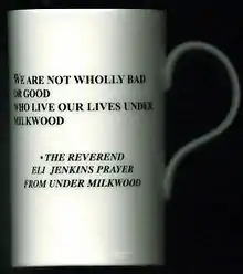 Jack Lloyd, a New Quay postman and the Town Crier, also lived on Church Street.[43] He provided the character of Llareggub's postman Willy Nilly, whose practice of opening letters, and spreading the news, reflects Lloyd's role as Town Crier, as Thomas himself noted on a work sheet for the play: "Nobody minds him opening the letters and acting as [a] kind of town-crier. How else could they know the news?"[44] It is this note, together with our knowledge that Thomas knew Jack Lloyd ("an old friend"),[45] that establish the link between Willy Nilly and Lloyd.[46]