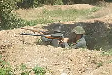 The Leichtes Maschinengewehr Modell 1925 (shortened to Lmg 25)[1] is a Swiss recoil operated light machine gun designed by Colonel Adolf Furrer of Waffenfabrik Bern in the 1920s and produced from 1925 to the 1960s.[2] It was the first machine gun in the Swiss Army that could be carried by a man. It takes the 7.5 mm Swiss Service cartridge from a 30-round box magazine and has a cyclic rate of fire of about 500 rounds-per-minute.[3] In 1957, the LMG 25 was replaced by the Stgw 57-Assault rifle.