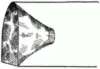 The framework of the bottom consists of three strips of wood, either hemlock, spruce, or pine (the first mentioned being the most durable), a little longer than the width of the pot, about 2¾ inches wide and 1 inch thick. In the ends of each of the outer strips a hole is bored to receive the ends of a small branch of pliable wood, which is bent into a regular semicircular curve. These hoops are made of branches of spruce or hemlock, or of hardwood saplings, such as maple, birch, or ash, generally retaining the bark. Three of these similar frames, straight below and curved above, constitute the framework of each pot, one to stand at each end and one in the center. The narrow strips of wood, in general ordinary house laths of spruce or pine, which form the covering, are nailed lengthwise to them, with interspaces between about equal to the width of the lathe. On the bottom the laths are sometimes nailed on the outside and sometimes on the inside of the cross pieces. The door is formed by three or four of the laths running the entire length near the top. The door is hinged on by means of small leather strips, and is fastened by a single wooden button in the center, or by two buttons, one at each end. The openings into the pot ... are two in number, one at each end, are generally knit of coarse twine and have a mesh between three-fourths of an inch and 1 inch square. They are funnel-shaped, with one side shorter than the other, and at the larger end have the same diameter as the framework. The smaller and inner end measures about 6 inches in diameter and is held open by means of a wire ring or wooden hoop. The funnels are fastened by the larger ends to the end frames of the pot, with the shorter side uppermost, so that when they are in place they lead obliquely upward into the pot instead of horizontally. The inner ends are secured in position by one or two cords extending to the center frame. The funnels are about 11 or 12 inches deep, and therefore extend about halfway to the center of the pot. They taper rapidly and form a strongly inclined plane, up which the lobsters must climb in their search for the bait. A two-strand manila twine is most commonly used for the funnels. Cotton is also used, but is more expensive and less durable.