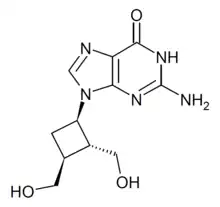 Lobucavir (previously known as BMS-180194, Cyclobut-G) is an antiviral drug that shows broad-spectrum activity against herpesviruses, hepatitis B and other hepadnaviruses, HIV/AIDS and cytomegalovirus.[1][2][3] It initially demonstrated positive results in human clinical trials against hepatitis B with minimal adverse effects but was discontinued from further development following the discovery of increased risk of cancer associated with long-term use in mice.[4] Although this carcinogenic risk is present in other antiviral drugs, such as zidovudine and ganciclovir that have been approved for clinical use, development was halted by Bristol-Myers Squibb, its manufacturer.[5]