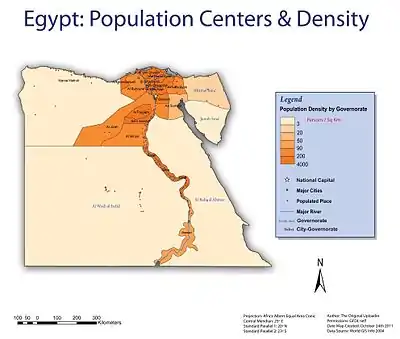 Data taken from CAPMAS:.[17] Information for population is in thousands, pop density - persons/km2 and area is in km2.