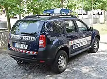 The Local Police, (Romanian: Poliția Locală, Romanian pronunciation: [poliˈt͡si.a loˈkalə]) of Romania is an institution of the Romanian Police that operates at a local level. The Local Police was established in 2011 by Law No. 155/2010. According to law, city councils can hire no more than one local policeperson for every 1,000 inhabitants. The Local Police generally receives a large part of a city council's budget, but there are controversies regarding the usefulness of the institution, which has been criticized for its poor coordination and poor police training.[1]