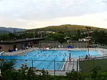 An outdoor swimming pool is located on a small hill opposite Kensington Square Shopping Centre, just across Kensington Avenue.