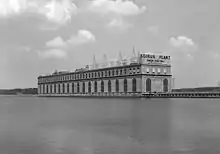 Construction began in 1910 and when completed in 1913 it was the largest capacity, single powerhouse electricity generating plant in the world. The Power House and spillways are owned and operated by Ameren Missouri and has a 142 MW capacity.[3] The powerhouse contains 15 generators, originally designed to produce 25 Hz instead of the 60 Hz alternating current used today. Keokuk and Hamilton Water Power landed contracts in 1910 to deliver 44.7 MW of electricity to three customers located in St. Louis, MO (more than 100 miles downstream), at a time when no electric power had been transmitted more than a few miles: The Union Electric Light and Power Company, Laclede Gas Company and United Railways Company, which operated the St. Louis Street Railway Company. Union Electric Co. purchased the facilities in 1925. The 25 Hz generators powered industrial customers and used for the Streetcars in St. Louis, Missouri.