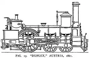 Locomotive Duplex was an experimental 4-cylinder steam locomotive designed by John Haswell of the Austrian State Railway Works at Vienna and built in 1861. It was exhibited at the 1862 International Exhibition and was then used on the line from Prague to Podmokly (part of Děčín today) where it worked till 1900.[1] Prague was the capital of Bohemia, which became part of the Austro-Hungarian Empire in 1867.