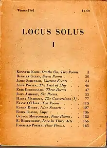 Locus Solus was an American journal of experimental poetry and prose that published four issues in 1961 and 1962, one (III-IV) a double issue. The magazine was edited by the writer Harry Mathews and the poets John Ashbery, Kenneth Koch, and James Schuyler,[1][2] all of whom contributed to its four issues. The content was completely in English but the journal was published in France (in Lans-en-Vercors)[2] by Mathews.[1]