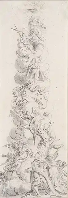 In the mid-1680s, he made designs for the Pestsäule (Trinity or Plague Column) on the Viennese Graben, which were carried out in 1687 under his direction by the brothers Peter and Paul Strudel, with whom, according to Tessin, he was friends.[16] Some sketches and drafts of this project have been preserved in the Theatermuseum in Vienna.[17]