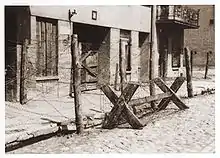 To ensure no contact between the Jewish and non-Jewish populations of the city, two German Order Police battalions were assigned to patrol the perimeter of the ghetto, including the Reserve Police Battalion 101 from Hamburg.[17] Within the ghetto, a Jewish Police force was created to ensure that no prisoners tried to escape. On 10 May 1940 orders went into effect prohibiting any commercial exchange between Jews and non-Jews in Łódź. By the new German decree, those caught outside the ghetto could be shot on sight. The contact with people who lived on the "Aryan" side was also impaired by the fact that Łódż had a 70,000-strong ethnic German minority loyal to the Nazis (the Volksdeutsche),[5] making it impossible to bring food illegally. To keep outsiders out, rumours were also spread by Hitler's propaganda saying that the Jews were the carriers of infectious diseases.[5] For the week of 16–22 June 1941 (the week Nazi Germany launched Operation Barbarossa), the Jews reported 206 deaths and two shootings of women near the barbed wire.[18]