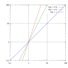 A log–log plot of y = x (blue), y = x2 (green), and y = x3 (red).