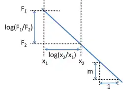 In other words, F is proportional to x to the power of the slope of the straight line of its log–log graph. Specifically, a straight line on a log–log plot containing points (F0, x0) and (F1, x1) will have the function: